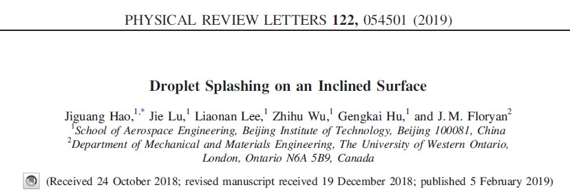 2019年2月5日,北京理工大學宇航學院郝繼光講師、胡更開教授和加拿大西安大略大學Floryan教授合作在物理學頂級的學術期刊《Physical Review Letters》(IF = 8.839)上發表了題為《Droplet splashing on an inclined surface》的研究論文。郝繼光為該論文第一和通訊作者,宇航學院2018級碩士研究生魯杰、2015級本科生李遼南及2017級碩士研究生吳志鵠分別為第二、第三和第四作者,北京理工大學為論文的第一單位和唯一通訊單位,該工作得到了國家自然科學基金和“111”引智計劃的支持。