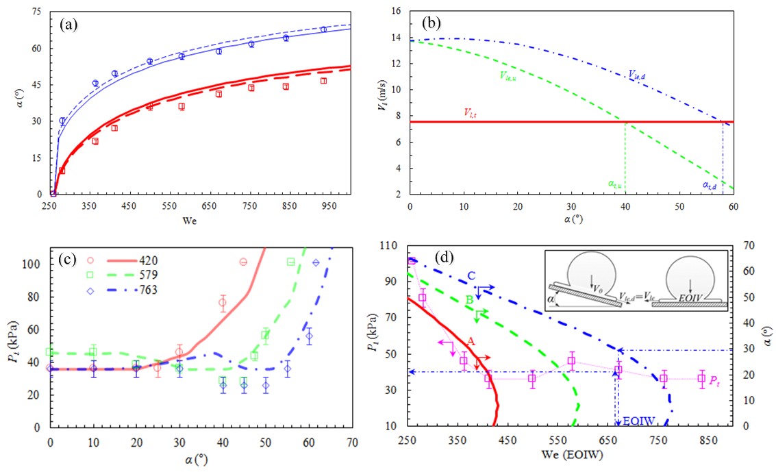 作為吸引人同時也是難理解的流體力學現象,前人針對液滴飛濺的研究主要集中于垂直撞擊,而自然界和一系列工程應用中的大部分撞擊都是傾斜的,液滴撞擊傾斜表面引起非對稱飛濺并最終抑制飛濺的機理尚未被理解。論文通過在真空室中開展液滴傾斜撞擊實驗,研究了液滴在不同環境壓力下撞擊傾斜表面的飛濺現象(如圖1所示),獲得了一系列條件下抑制液滴飛濺所需的臨界條件(如圖2中的符號所示),通過對撞擊過程的機理分析,建立了一個理論模型,模型計算結果可以很好的吻合一系列條件下的實驗結果(如圖2中的曲線所示)。上述結果清楚地解釋了液滴在傾斜表面形成非對稱飛濺的機理,同時,實驗研究和理論分析均表明液滴撞擊后形成的液膜前端速度決定了液滴是否發生飛濺,這為液滴飛濺機理的進一步研究提供了新的思路和方向。