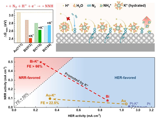 圖1. Bi–K+催化體系實現高效電化學合成氨:理論模擬,反應模型與催化性能
