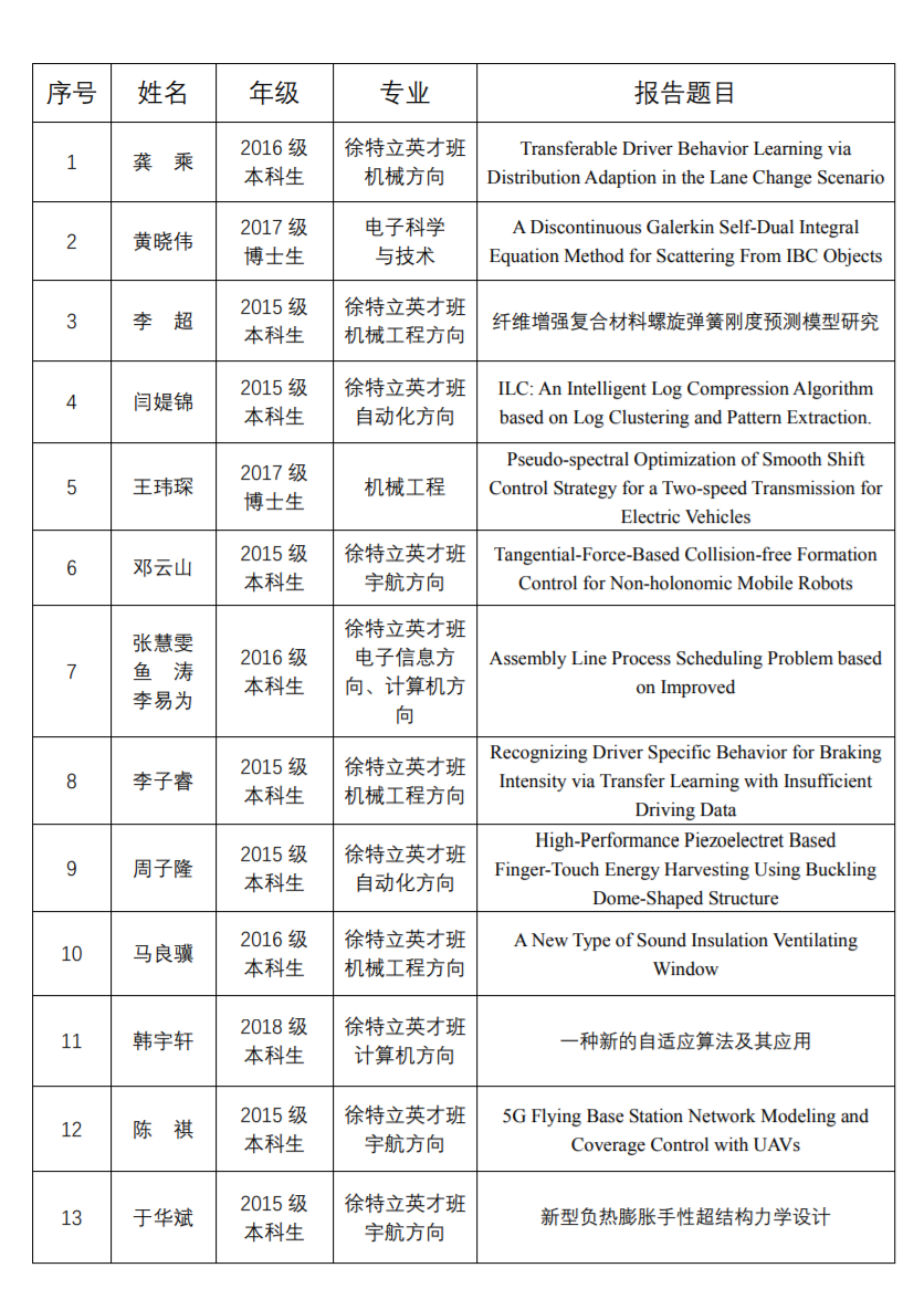 在下午分論壇學術(shù)交流環(huán)節(jié),13名同學分兩組在分會場作報告,17級博士生王瑋琛的電動汽車平滑換擋優(yōu)化研究了電動汽車的平穩(wěn)換擋控制策略,優(yōu)化控制后離合器發(fā)動機換擋挺度可提高約60%,可以較好的跟蹤最優(yōu)解的運動軌跡,具有實時性和有效性;15級本科生李子睿通過遷移學習的手段,實現(xiàn)了通過少量數(shù)據(jù)的輸入完成從成熟的駕駛員模型到新的個性化駕駛員模型的轉(zhuǎn)變,而且通過改進算法,實現(xiàn)了少數(shù)據(jù)量下80%以上的預測準確度,高于其他方法的70%,完成了算法層的突破;18級本科生韓宇軒,對傳統(tǒng)的數(shù)值積分公式做出了自適應(yīng)算法上的改進,展現(xiàn)出非同尋常的科研創(chuàng)新熱情和能力。論文交流后,現(xiàn)場評委老師對大家的報告進行了點評:楊國孝十分認可同學們?nèi)〉玫某晒隙诵焯亓W院學子科研中展現(xiàn)出的學科融合的特點;胡紀濱肯定了大家的學術(shù)精神,并希望大家繼續(xù)保持蓬勃的求知欲,多問幾個為什么,研究課題的目的是什么,用的定理是怎么來的。
