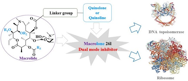 耐藥菌感染已成為全球人類健康的主要威脅之一。但抗生素面臨著一上市就迅速產(chǎn)生耐藥性的研發(fā)困境。大環(huán)內(nèi)酯類抗生素在細(xì)菌核糖體狹窄的新生肽通道親和從而阻礙蛋白質(zhì)輸出。喹喏酮作用于拓?fù)洚悩?gòu)酶,形成酶-DNA-喹喏酮三體復(fù)合物,干擾DNA復(fù)制過(guò)程。基于雜合抗生素的理念——將兩個(gè)作用機(jī)理不同的分子共價(jià)連接,獲得具有雙重作用模式的雜合物,以克服其中一種或兩種藥物的耐藥機(jī)制,重獲抗菌活性,并且大幅降低微生物耐藥性的產(chǎn)生幾率。本研究的難點(diǎn)是核糖體和拓?fù)洚悩?gòu)酶為兩個(gè)迥異的靶標(biāo),對(duì)配體的結(jié)構(gòu)要求差異較大,雜合物很難實(shí)現(xiàn)同時(shí)作用這兩個(gè)靶標(biāo)。梁建華課題組以阿奇霉素為先導(dǎo),將喹諾酮類化合物以酰化的方式結(jié)合于阿奇霉素C-6位上,經(jīng)過(guò)篩選,發(fā)現(xiàn)阿奇霉素與環(huán)丙沙星/加替沙星的雜合物體可以通過(guò)類似于氟喹諾酮的方式——使促旋酶中毒來(lái)抑制細(xì)菌DNA 的復(fù)制,從而提高化合物對(duì)高水平耐藥菌的抗菌活性。研究采用了DNA超螺旋抑制實(shí)驗(yàn)、DNA裂解實(shí)驗(yàn)以及分子對(duì)接和全細(xì)胞水平生長(zhǎng)抑制等實(shí)驗(yàn)驗(yàn)證,結(jié)果具有一致性。這種既可抑制蛋白合成又可抑制DNA復(fù)制的雙重作用模式為未來(lái)合理設(shè)計(jì)抗耐藥菌的新型抗生素奠定了基礎(chǔ)。