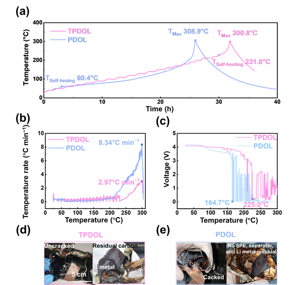 由于固態電解質具有固有的高熱穩定性、不流動性和正/負極兼容性,因此電解質的固態化成為解決電池的安全性問題的終極方案。自支撐固態電解質具有較差的電極/電解質界面接觸,不利于電池長期穩定循環,而原位聚合電解質因較好的界面接觸和較低的界面電阻而受到越來越多的關注。然而,傳統的聚烯烴基聚合物電解質通常需要添加額外的液態電解質,這不可避免地會影響電池的安全性。原位聚合1,3-二氧戊環(PDOL)是一種通過DOL開環聚合獲得的聚醚基電解質,其不僅擁有較高的鋰離子電導率(>1 mS cm?1),且與金屬鋰負極具有出色的兼容性而廣受贊譽。盡管PDOL電解質不需要添加液態潤濕劑,但DOL單體的殘留和低聚物的存在會降低電池的安全性。一旦電池溫度超過110 ℃,PDOL電解質就會發生熱分解,生成氣態易燃小分子產物(如DOL、甲醛等),影響電池安全性能。事實上,金屬鋰電池的熱安全性主要與電解質的熱穩定性及其在高溫下與金屬鋰負極的相容性有關。因此,同時實現PDOL的高熱穩定性與高電化學穩定性仍然是安全性金屬鋰電池的巨大挑戰。