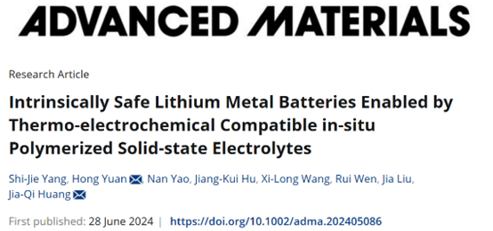 論文詳情:Shi-Jie Yang, Hong Yuan*, Nan Yao, Jiang-Kui Hu, Xi-Long Wang, Rui Wen, Jia Liu, Jia-Qi Huang*. Intrinsically Safe Lithium Metal Batteries Enabled by Thermo-electrochemical Compatible In-situ Polymerized Solid-state Electrolytes, Adv. Mater. 2024, 2405086.