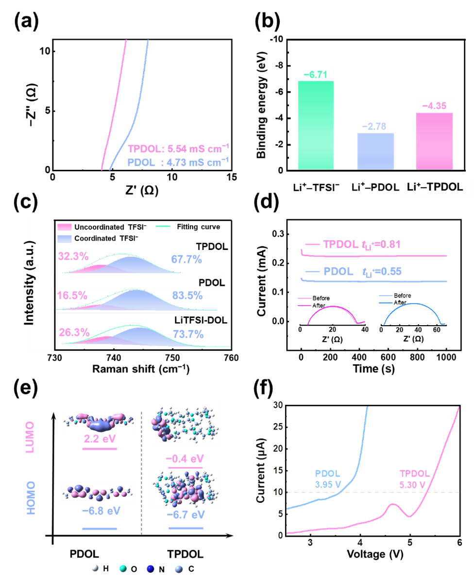 TPDOL電解質表現出更高的鋰離子電導率,達到5.54 mS cm?1,與PDOL的醚基(?2.78 eV)相比,TGIC的羰基與鋰離子的結合能更大(?4.35 eV),這有利于促進鋰鹽的解離,因此,在TPDOL電解質中出現了更多的解離態TFSI?。交聯結構同樣可以阻止TFSI?的移動。因此,TPDOL電解質的鋰離子遷移數從0.55大幅增加到0.81。此外,引入TGIC后聚合物的交聯有效地提高了聚合物水平,消除了自由DOL分子。TPDOL電解質的電化學窗口從3.95 V增加到5.30 V,具有很強的抗氧化能力(圖2)