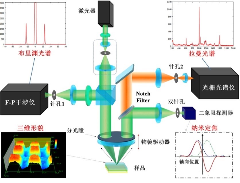 鑒于此,該團隊在國家自然基金重點項目“機械形態性能激光分光瞳差動共焦布里淵—拉曼光譜測量原理與傳感系統(51535002)”等項目支持下,發明了圖1所示的高穩定、高分辨、抗散射分光瞳激光差動共焦拉曼-布里淵(Divided-aperture Laser Differential Confocal Raman-Brillouin,DLDCRB)圖譜成像新方法(授權中國發明專利ZL 201410086366.5和歐洲發明專利EP 3118608 B1),該方法將分光瞳激光差動共焦顯微技術與拉曼光譜和布里淵光譜探測技術相結合,通過差動共焦測量技術進行納米精度的樣品定焦,來提高系統空間分辨力和穩定性;通過分光瞳斜向激發與探測技術進行反射光和層間散射光等干擾光的抑制,來提高系統的光譜探測信噪比;通過拉曼光譜與布里淵光譜的同源激光激發與高分辨分離探測,來實現微區幾何形貌、拉曼光譜和布里淵光譜的高穩定、高分辨原位圖譜成像。