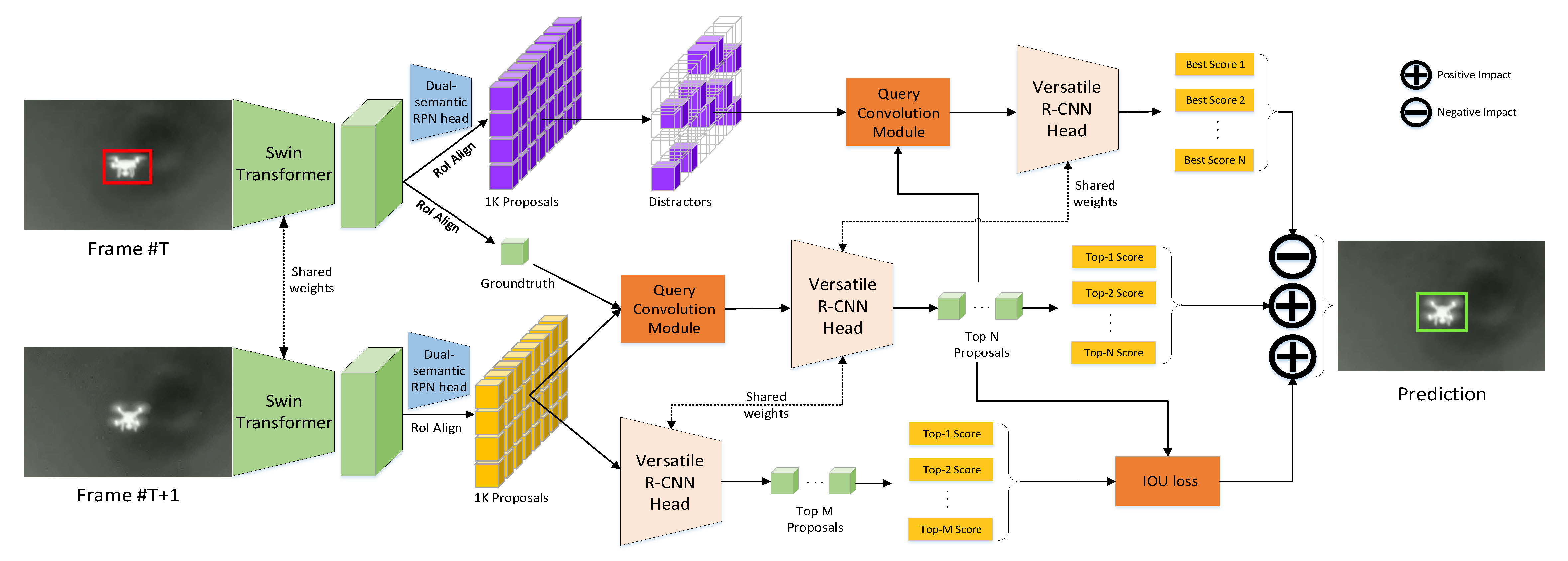 針對實際環境中紅外無人機目標尺度和屬性差異顯著的問題,許廷發教授團隊提出并構建了首個大規模紅外無人機目標跟蹤數據集,Anti-UAV410。該數據集包含410個紅外視頻序列和超過40萬個無人機目標標注框。同時,團隊提出了一種適用于復雜場景下的紅外小目標智能定位與跟蹤方法——SiamDT。該方法能夠有效抑制紅外圖像中的復雜背景干擾,實現對弱小目標的準確定位與跟蹤,方法框架如圖1所示。