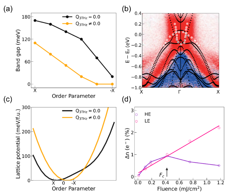 為了解決上述問(wèn)題,研究人員在飛秒及原子的時(shí)空尺度上深入研究了在不同光場(chǎng)強(qiáng)度下Ta2NiSe5中的多體相互作用。他們發(fā)現(xiàn)結(jié)構(gòu)畸變可以在和純電子過(guò)程相當(dāng)?shù)臅r(shí)間尺度內(nèi)發(fā)生,成功地調(diào)和了相互矛盾的實(shí)驗(yàn)結(jié)果。與激子絕緣體序參量耦合的聲子(2 THz)和普通相干聲子(3 THz)之間的非簡(jiǎn)諧相互作用導(dǎo)致非平衡勢(shì)能面的變化和聲子頻率上轉(zhuǎn)換,加速了晶格的序參量反轉(zhuǎn)并導(dǎo)致能隙關(guān)閉。這一過(guò)程與純電子過(guò)程相互競(jìng)爭(zhēng),特別是在強(qiáng)場(chǎng)條件下更為顯著。