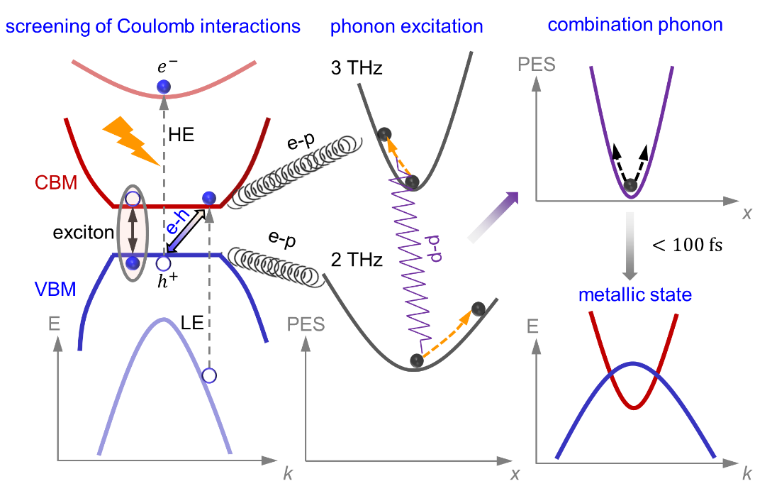 通過(guò)研究不同準(zhǔn)粒子(電子、聲子、激子等)在光場(chǎng)作用下的響應(yīng)時(shí)間以及它們對(duì)能隙的影響,基于超快泵浦探測(cè)技術(shù)的實(shí)驗(yàn)手段有望解決這一問(wèn)題。由于載流子的特征響應(yīng)時(shí)間通常在百飛秒以內(nèi),因此被廣泛用作電子子系統(tǒng)(e-h)驅(qū)動(dòng)激子絕緣態(tài)形成的主要判據(jù)。然而,已有的超快實(shí)驗(yàn)卻存在互相矛盾的結(jié)論。例如,采用時(shí)間分辨的角分辨光電子能譜(tr-ARPES)進(jìn)行研究時(shí),在強(qiáng)光場(chǎng)下,能隙的關(guān)閉時(shí)間小于100 fs,被認(rèn)為是等離子體誘導(dǎo)下激子關(guān)聯(lián)性減弱的結(jié)果,即是一個(gè)純粹的電子過(guò)程[Nat. Commun. 9, 4322 (2018)]。然而,也有實(shí)驗(yàn)表明,在較弱光場(chǎng)條件下,最大的能隙響應(yīng)發(fā)生在聲子響應(yīng)時(shí)間內(nèi)(約300 fs),表明結(jié)構(gòu)畸變是主導(dǎo)的機(jī)制[PNAS 120, e2221688120 (2023)]。這些相互矛盾的實(shí)驗(yàn)結(jié)果暗示著可能存在多種機(jī)制共同作用,導(dǎo)致激子絕緣體形成的復(fù)雜過(guò)程。