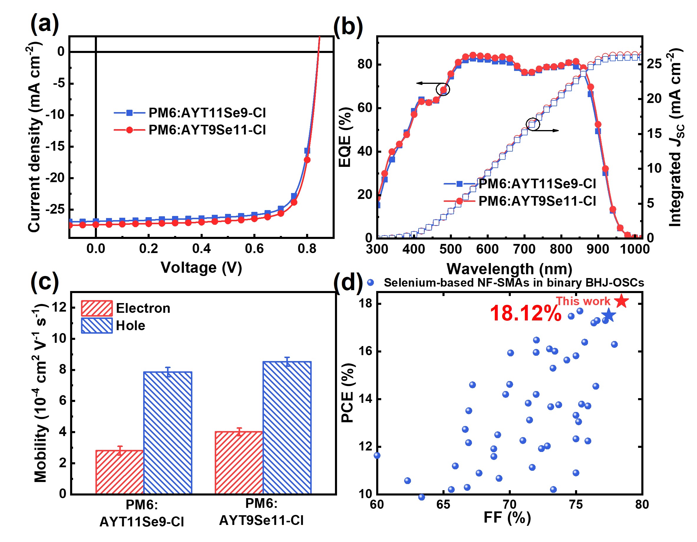 單晶堆積模型分析表明,與AYT11Se9-Cl相比,硒吩β位上具有較長n-十一烷基鏈的AYT9Se11-Cl形成了更緊密和有序的分子間堆積,因而具有額外的非共價相互作用。盡管這些雙不對稱異構體在純膜中具有相似的吸收和HOMO/LUMO能級,但AYT9Se11-Cl在純膜表現出更有效的電荷傳輸行為以及更高的電子遷移率。此外,與PM6:AYT11Se9Cl相比,PM6:AYT9Se11-Cl共混膜具有更強的結晶度和更明細的結晶取向以及更合適的相分離形貌特征,這與增加的電子-空穴遷移率以及抑制的電荷復合有關。因此,基于PM6:AYT9Se11-Cl的器件實現了18.12%的最優光電轉換效率,明顯高于基于PM6:AYT11Se9-Cl的器件結果(17.52%),是目前基于硒取代受體本體異質結型二元有機太陽能電池器件的最高值之一。綜上,這項工作證明,基于不對稱硒吩以及外部不對稱烷基鏈的區域異構是一種協同和實用的方法用于開發高性能SMAs,不僅可以調節分子間聚集、晶體填充和混合膜形態,而且能進一步提高相應OSCs器件性能。