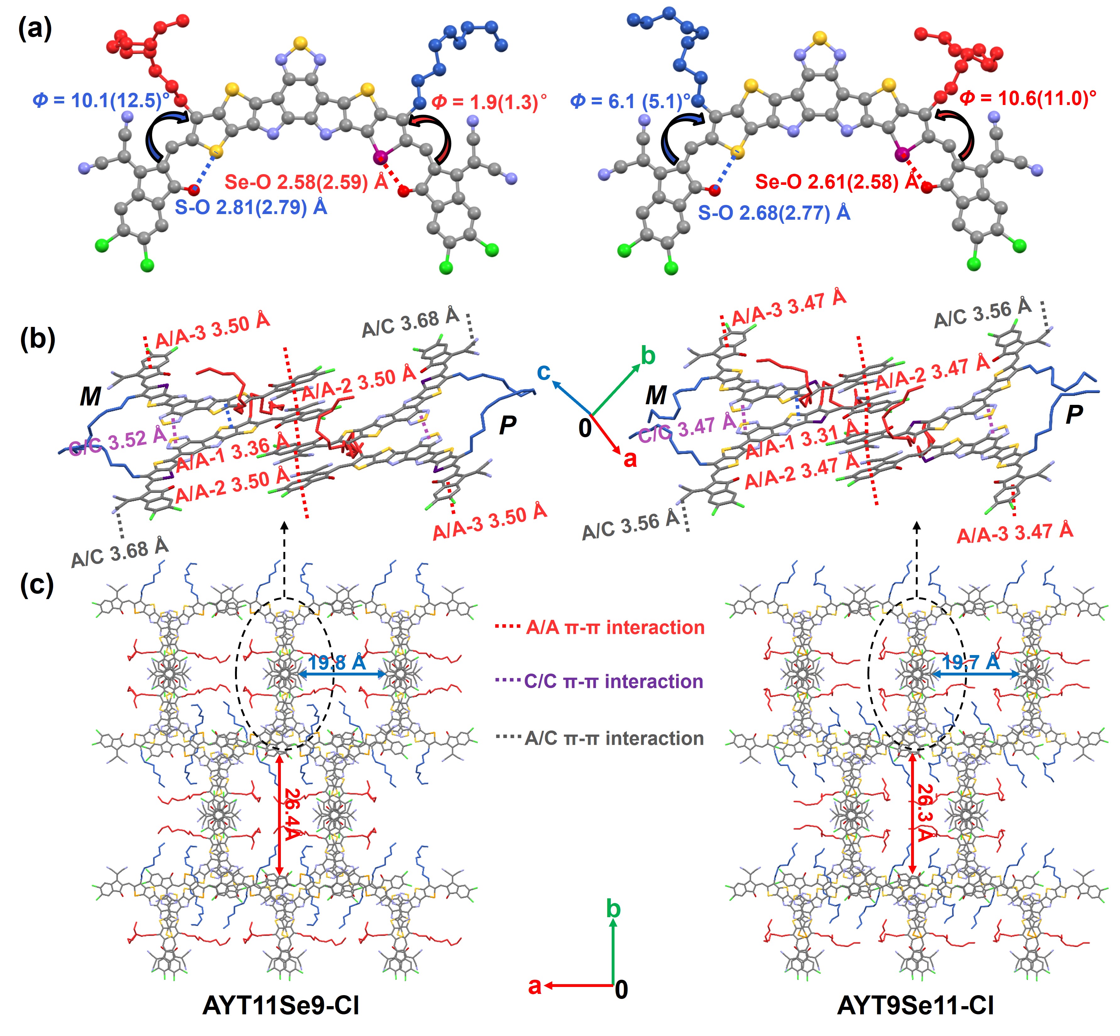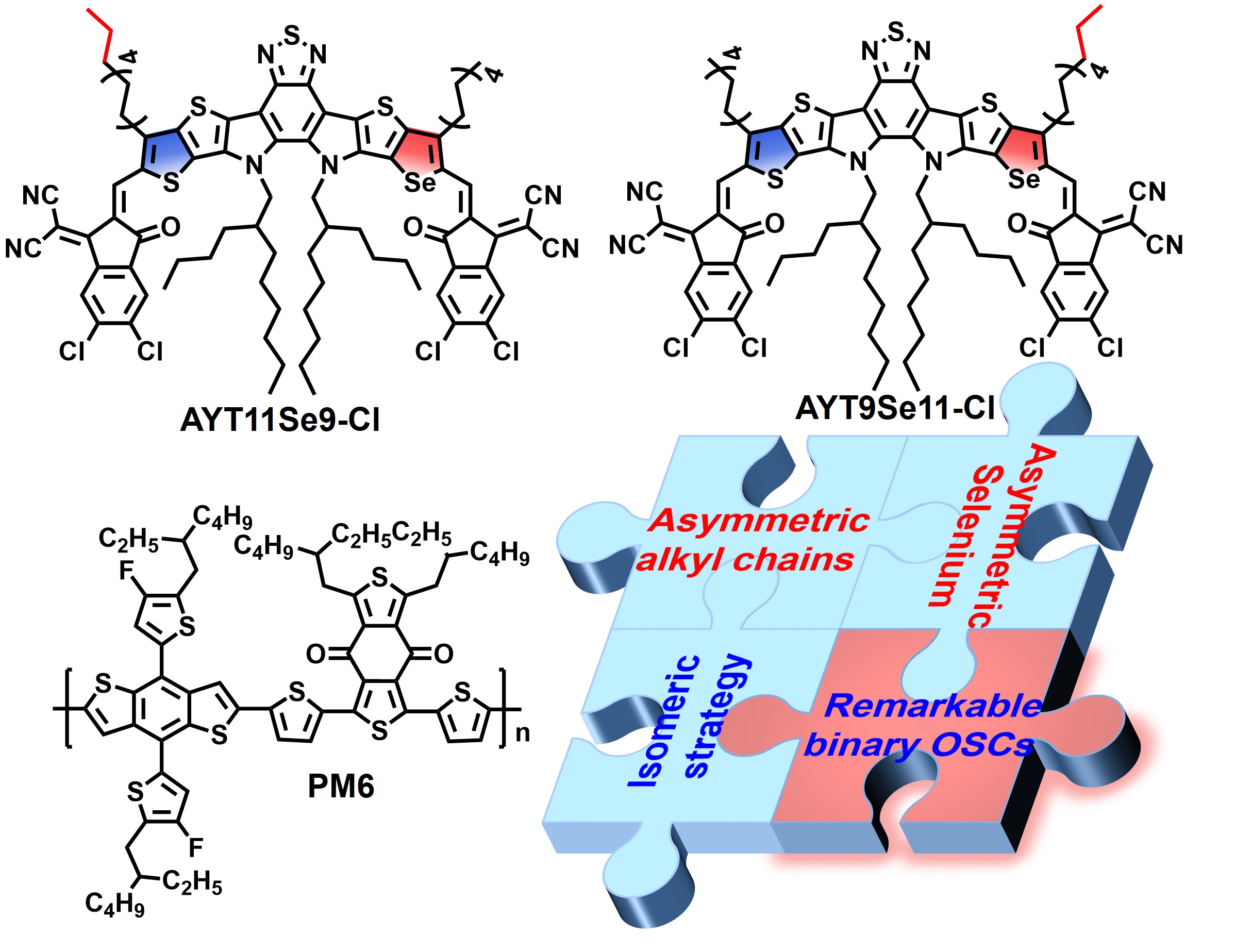 針對上述的關鍵科學問題,王金亮教授團隊在前期硒和異鹵原子取代砌塊集成的新型單分散受體材料的創制及其在高性能有機太陽能電池中的應用研究工作(Angew. Chem. Int. Ed. 2021, 60, 19241, ESI高被引論文; Angew. Chem. Int. Ed. 2022, 61, e202209454; Energy Environ. Sci., 2021, 14, 3945-3953, 前封面和高被引論文; Energy Environ. Sci., 2022, 15, 320; Energy Environ. Sci., 2021, 14, 90,高被引論文;Adv. Funct. Mater., 2022, 32, 2200807; ACS Energy Lett., 2018, 3, 2967等)的基礎上,為了實現更高效率的硒吩類受體材料體系,將基于硒吩的不對稱中心核工程和不同的烷基鏈策略相結合,在不改變烷基鏈總長度的情況下,最近設計并合成了一對A-D1A’D2-A型雙不對稱異構體(AYT11Se9-Cl和AYT9Se11-Cl,其具有相同的苯并噻二唑作為A’單元和兩個缺電子端基作為A單元,但同時具有兩個不同的基于硒吩和噻吩的不對稱D1A′D2中心核,并且分別在中心單元中最外側的硒吩環/噻吩環處連接有 n -壬基和 n -十一烷基鏈。系統地探討了兩種不對稱區域異構體的光電行為、詳細分子間填充的單晶結構、與聚合物給體PM6的共混形態以及相應OSCs的性能的影響。