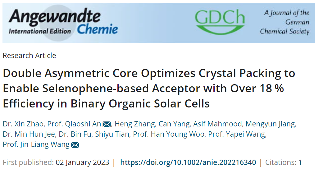 近期,北京理工大學化學與化工學院王金亮教授團隊在集成外側烷基不對稱異構化和單硒取代策略的硒吩類小分子受體材料創制及其在高性能有機太陽能電池的應用研究方面取得重要進展,相關研究成果發表在國際化學領域頂級期刊《Angewandte Chemie International Edition》上,題為“Double Asymmetric Core Optimizes Crystal Packing to Enable Selenophene-based Acceptor with Over 18?% Efficiency in Binary Organic Solar Cells”。 北京理工大學為唯一通訊單位,化學與化工學院王金亮教授和安橋石特別研究員為共同通訊作者,碩士研究生趙鑫和安橋石特別研究員為該論文的共同第一作者。