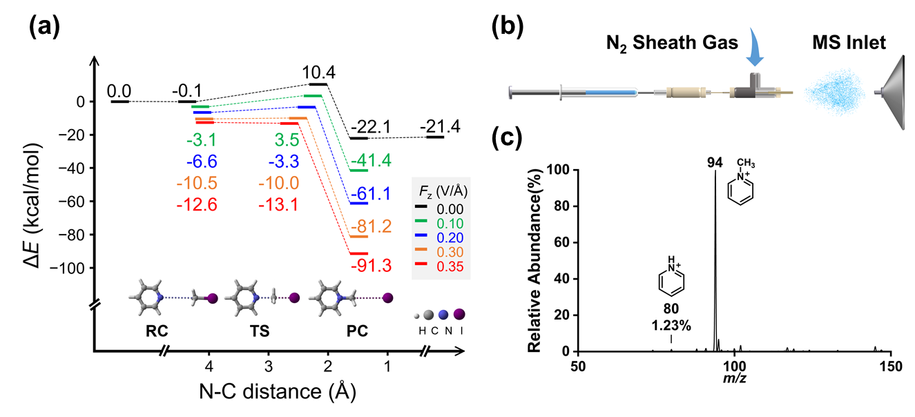 圖1. 水微滴中門舒特金反應。(a) 密度泛函理論計算門舒特金在不同電場強度下的反應能壘。 (b) 實驗設置。(c) 當鞘氣壓力為80 psi,反應距離為20 mm時,門舒特金反應產物的典型質譜。