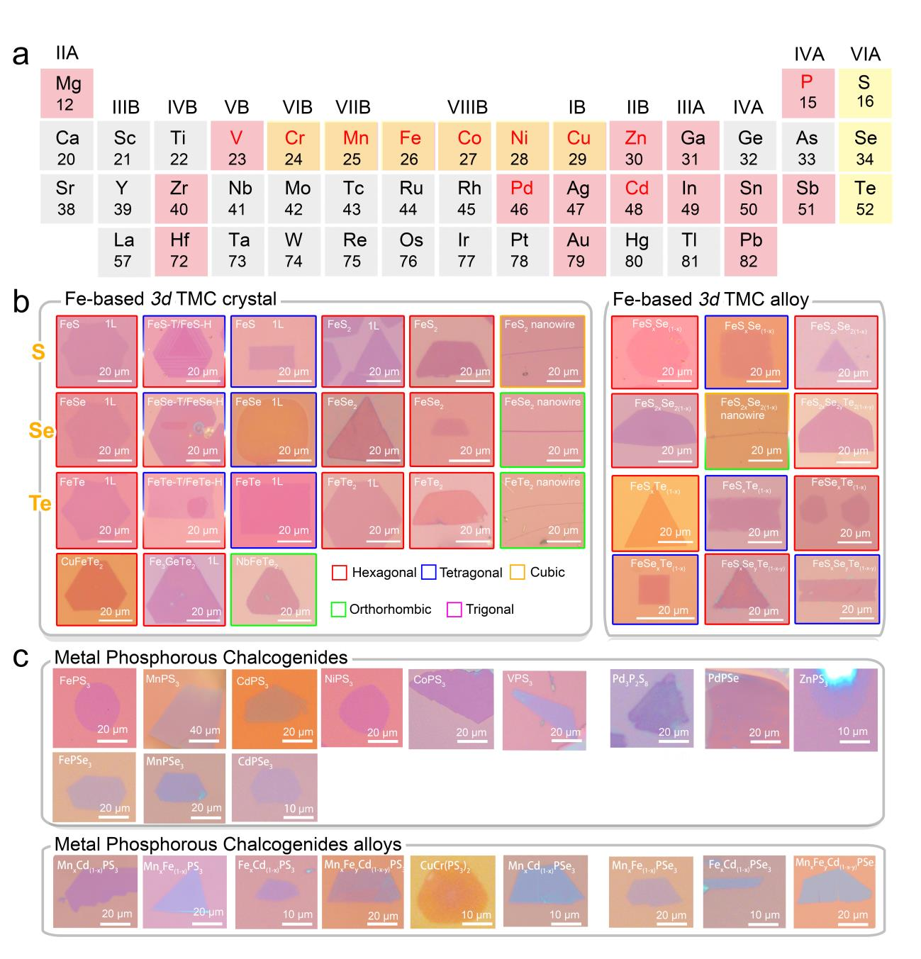 基于該機(jī)制,團(tuán)隊(duì)成功地合成了60多種類型的2D材料,其中TMCs 30種,TMPCs 21種;大多數(shù)材料尤其是TMPCs,從未見報(bào)道通過(guò)CVD方法合成。此外,通過(guò)擴(kuò)展該方法,團(tuán)隊(duì)還成功合成了其它基于不同相的三元過(guò)渡金屬(如Cr、Mn和Cu)硫族化合物,進(jìn)一步證明了該生長(zhǎng)方法的普適性。