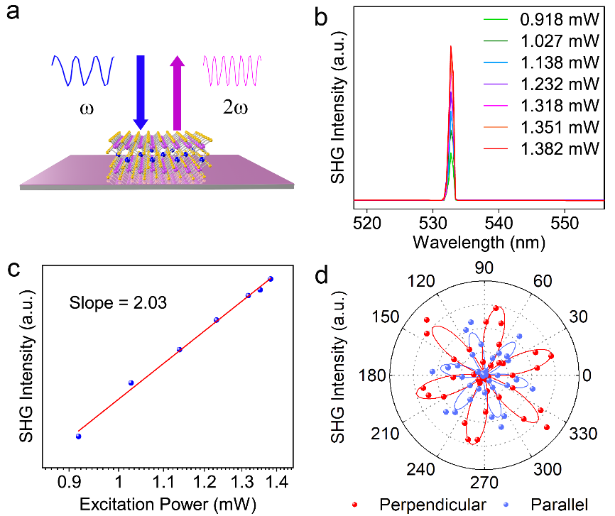 圖3. 在1064 nm激光下V3S5的SHG信號。(a) SHG測試示意圖。(b) 激光功率和SHG強度的關系;(c)二次非線性系數擬合圖;(d)SHG強度分別沿V3S5平行和垂直方向的偏振角變化關系。