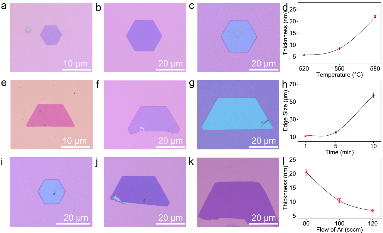 圖2. 二維V3S5可控生長。(a-c)V3S5光學形貌分別生長于520 ?C(a),550 ?C(b)和580 ?C(c)。(d)不同生長溫度下V3S5平均厚度分布。(e-g)V3S5在不同生長時間分別生長于1 min(e)、5 min(f)和10 min(g)光學形貌。(h)二維V3S5平均尺寸與生長時間的關系。(i-k)V3S5在不同氬氣流速下生長的光學形貌分別生長于80 sccm(i)、100 sccm(j)和120 sccm(k)。(l)V3S5平均厚度與Ar流速的關系。