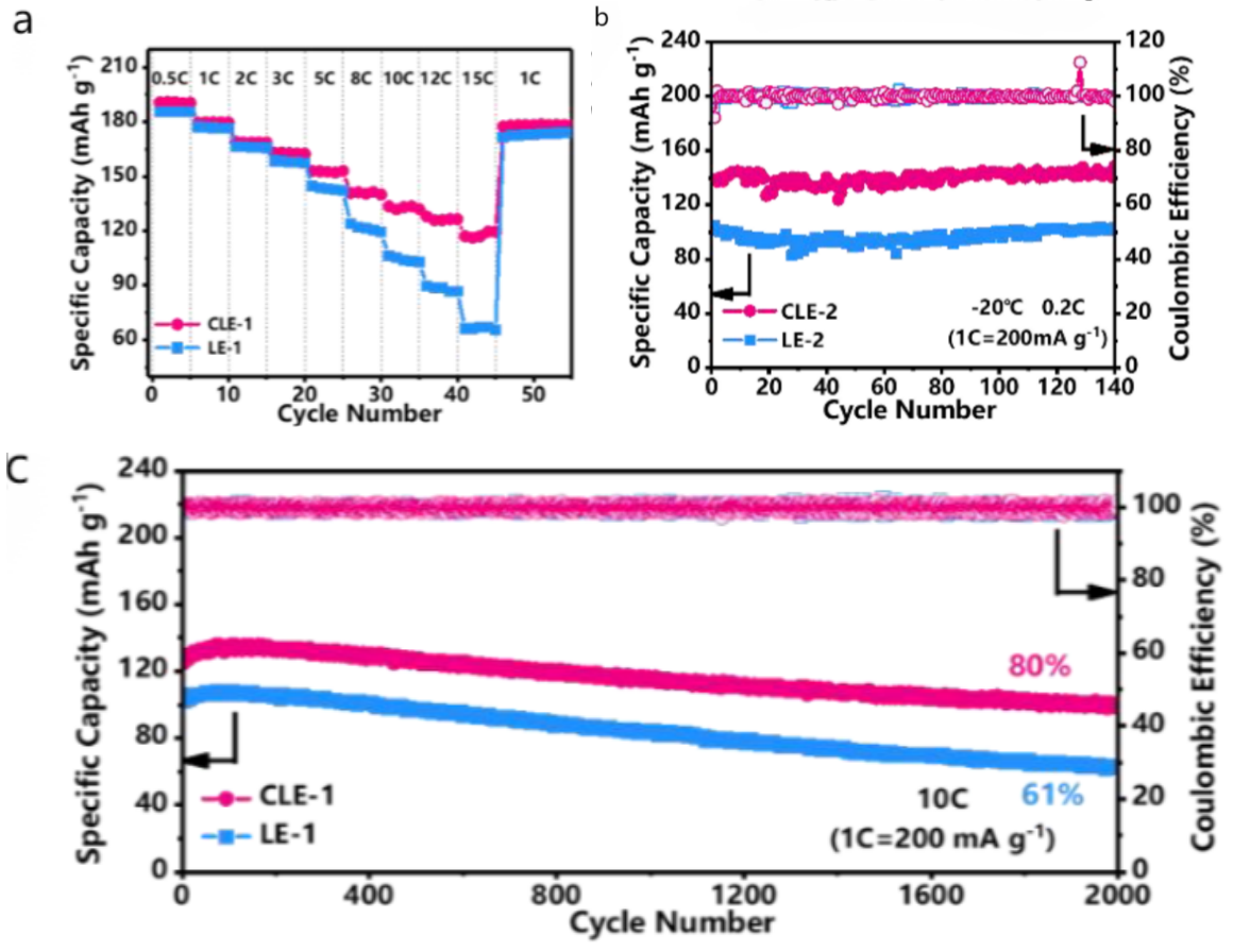 圖3 使用不同電解質(zhì)電池的倍率性能。 (b) Li | | NCA電池在0.2C和-20℃下的循環(huán)性能。(c) 10C下電池的長循環(huán)性能。