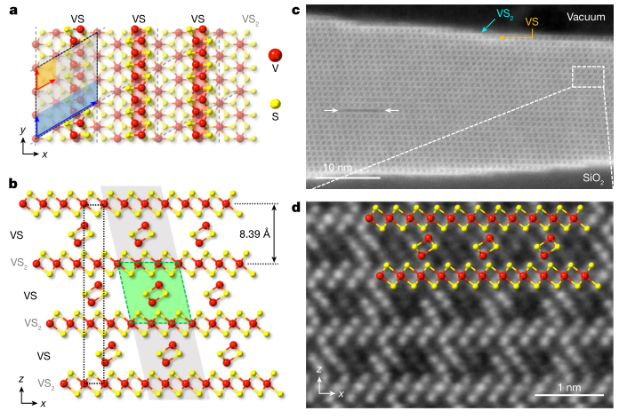 圖2 VS2-VS 超晶格的原子結構。a, VS2-VS超晶格的俯視圖原子模型。b, VS2-VS 超晶格的側視圖原子模型。c, VS2-VS 超晶格的橫截面 ADF 圖像。d, c中白色矩形的放大 ADF 圖像,與原子模型結構一致。