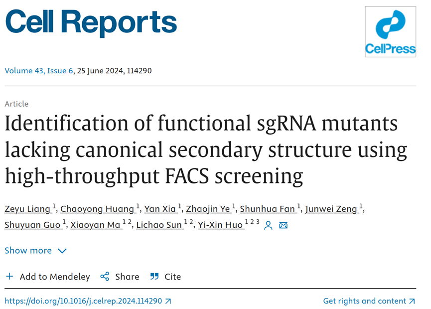 近日,北京理工大學(xué)霍毅欣教授團(tuán)隊(duì)在CRISPR/Cas9系統(tǒng)功能性sgRNA突變體篩選方面取得重要進(jìn)展。相關(guān)研究成果以“Identification of functional sgRNA mutants lacking canonical secondary structure using high-throughput FACS screening”為題發(fā)表在Cell 子刊《Cell Reports》上(https://doi.org/10.1016/j.celrep.2024.114290)。該工作以北京理工大學(xué)為第一通訊單位,博士生梁澤宇為第一作者,霍毅欣教授為通訊作者。