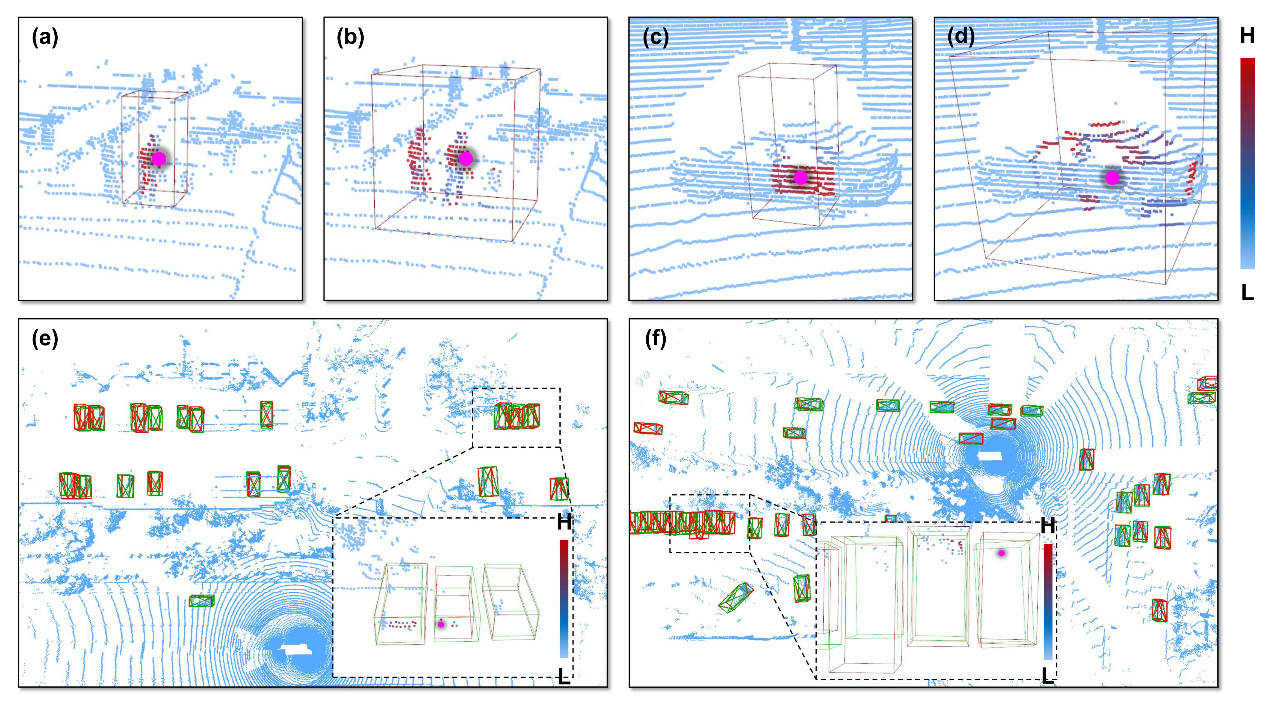 該方法基于混合尺度注意力機制的強大多尺度特征捕獲能力(見圖2(a)-(d)),在大規模Waymo數據集上的檢測精度超過了同期性能最優的雙階段檢測器。圖2(e)-(f)展示了部分在Waymo數據集上的部分檢測結果,該方法可以精確檢測僅具有極度稀疏點云表示的遠距離車輛目標,并在處理帶有巨大尺度變化的密集行人時也表現出優異的性能。