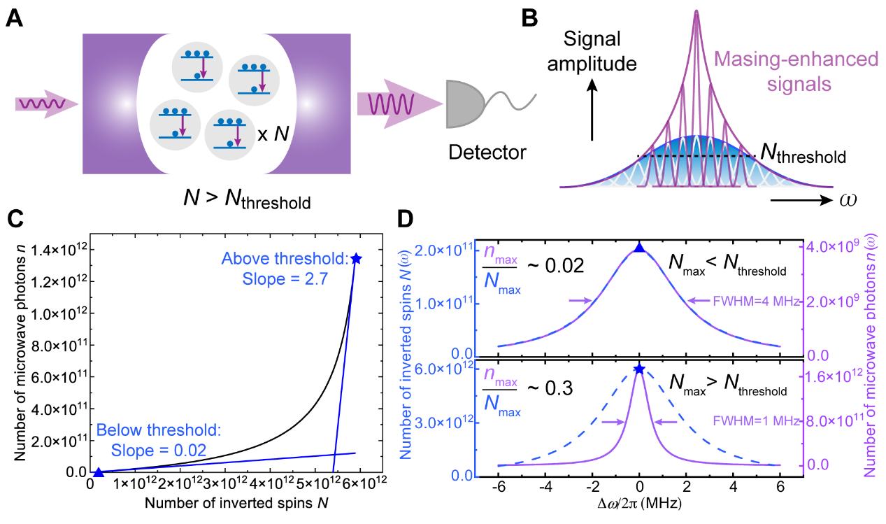 為了消除上述限制因素的影響,研究人員提出將室溫固態微波激射技術同量子傳感相結合,從而提高靈敏度,原理如圖1A和B所示。研究人員首先通過理論計算,證實了對于具有非均勻展寬的系綜體系,微波激射的閾值效應以及信號放大作用可以使固態自旋系綜的電子順磁共振譜線變窄、信號幅度提升(圖1C和D),為提升基于譜線斜率探測手段的量子傳感技術靈敏度提供了條件。