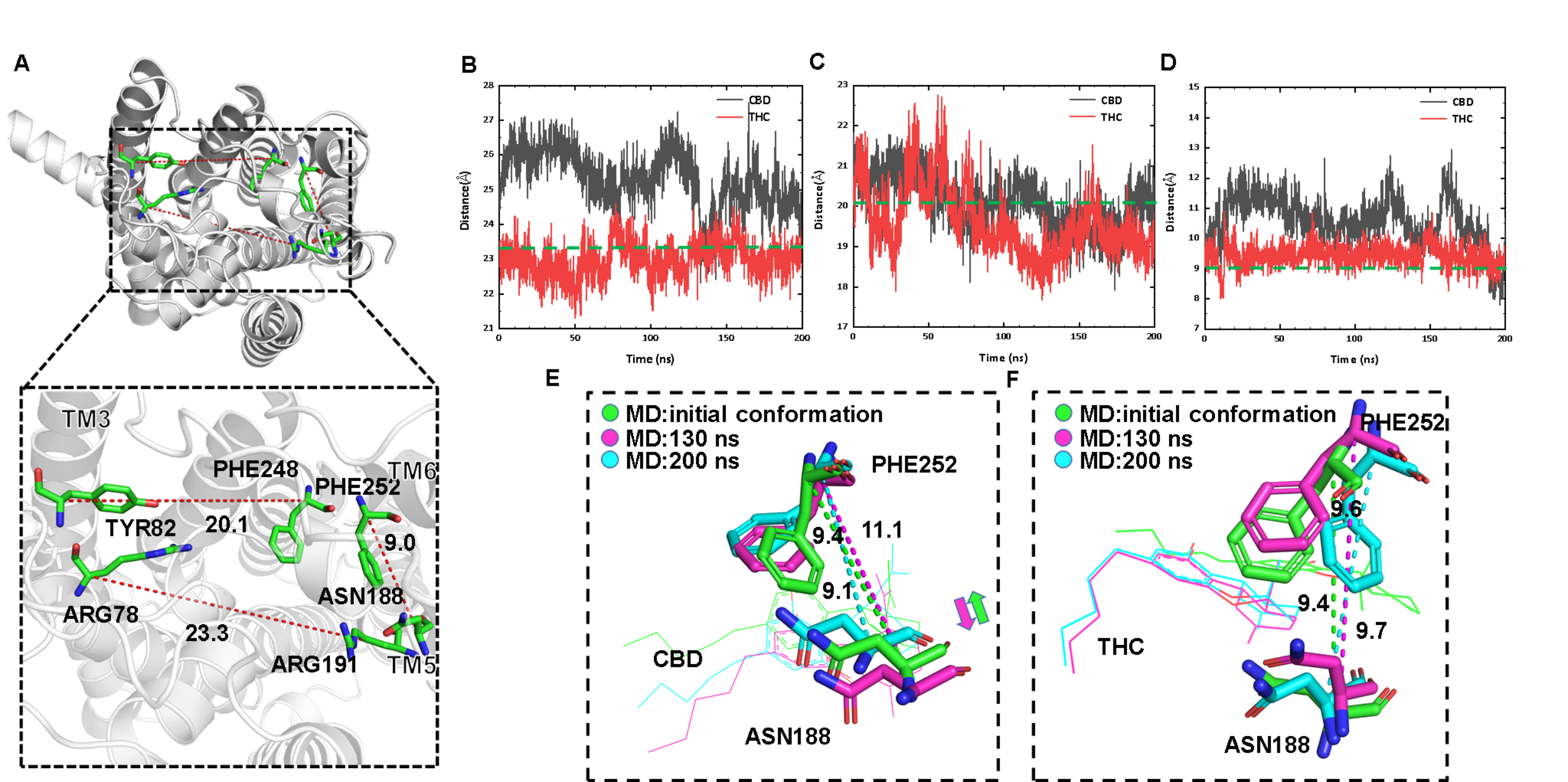 為了進一步探索大麻二酚與GPR18之間的具體作用模式,團隊運用了誘導契合對接技術,并結合分子動力學模擬和拉伸分子動力學模擬等先進融合計算手段。誘導契合對接結果顯示,大麻二酚與GPR18的結合親和力低于四氫大麻酚,證實了GPR18的活性口袋不一定是部分激動劑的首選。分子動力學模擬進一步揭示了大麻二酚-GPR18復合物在200 ns期間的穩定構象變化,發現其可能通過改變活性口袋內關鍵殘基的距離來觸發GPR18的激活。與大麻二酚相比,四氫大麻酚作為完全激動劑,在與GPR18結合時展現出相對“亞穩態”的構象,說明可能形成了一種“收縮空間”,通過增加活性口袋的機械約束實現其完全激動作用。