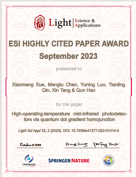 北京理工大學郝群教授團隊在室溫運行中波紅外探測器研究方面取得突破性的進展,相關論文于2023年1月發表于光學頂刊Light:Science & Applications,獲得封面論文。近日該論文入選ESI高被引。