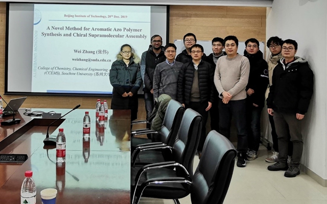 12月20日下午,由北京理工大學研究生院主辦、材料學院承辦的“21世紀學科前沿”系列學術報告在中關村校區5號教學樓1011會議室舉行。蘇州大學化學化工學院張偉教授應材料學院邀請作了“芳香偶氮聚合物合成新方法及超分子手性組裝”的報告。材料學院黃木華特別研究員主持報告會,來自材料學院的李生華特別研究員和研究生們參加了此次報告。