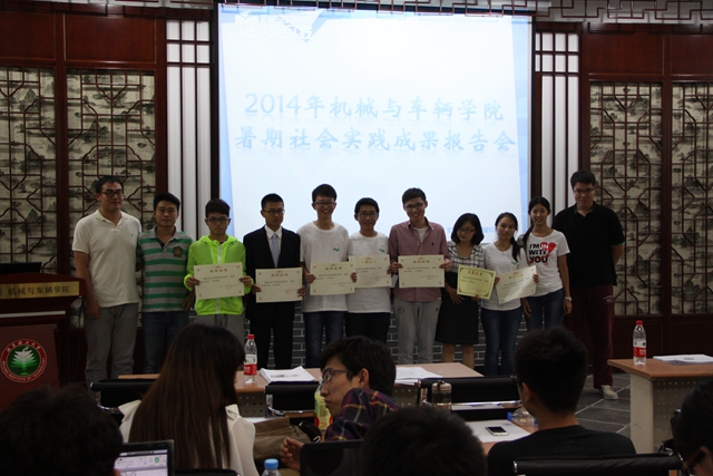 2014年9月20日,機械與車輛學院暑期社會實踐成果報告會在車輛實驗樓報告廳順利舉行。本次成果報告會共有 16支實踐團進行成果展示及答辯。與會嘉賓有機械與車輛學院團委副書記郝佳馨,研究生輔導員韓陽,2011級輔導員陳真權,以及往屆實踐團獲獎代表程子兵、周凱。.
