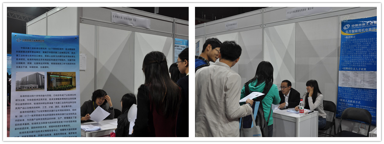 2014年10月20日,我校在體育館主館舉辦了中國兵器工業集團專場招聘會。中國北方工業公司、中國北方車輛研究所、中國兵器工業標準化研究所、中國北方發動機研究所、北方夜視科技集團有限公司、西北工業集團有限公司等56家中國兵器工業集團下屬單位前來參會,吸引約3000名校內外學生到場應聘。