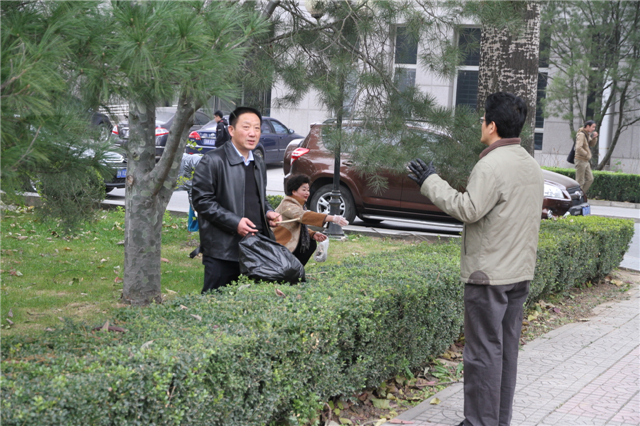 2014年11月15日下午,后勤集團530余名干部職工在各黨支部書記的帶領下奔赴各自責任區。勞動中,各支部腳踏實地,以平行推進的方式仔細清掃,大家手持勞動工具分工協作,仔細清理每一個角落、每一片草地。干部職工們把校園當做自己的家園,不怕臟、不怕累,不易夾起的垃圾和不好清理的衛生死角,大家就用手揀。衣服臟了、手劃破了,但大家沒有任何怨言,雖然都累得滿頭大汗,但大家堅持一鼓作氣拿下責任區,現場一派熱火朝天的勞動氣氛。