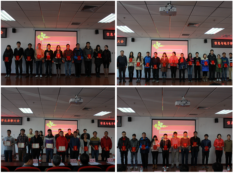 大會首先由楊靜副院長宣讀《關于表彰2013-2014學年優秀學生標兵、優秀學生、優秀學生干部、先進班集體、優良學風班和優良學風宿舍的決定》并向獲獎代表頒獎;副院長薛正輝宣讀《關于表彰信息與電子學院“我們為社會主義核心價值觀代言”主題團日活動優秀獎、海報設計大賽優勝獎的決定》、《關于表彰信息與電子學院2013-2014學年優異生獎學金的決定》并頒獎;黨委副書記副院長黨華宣讀《關于表彰信息與電子學院2013-2014學年社會工作優秀獎、優秀社團獎的決定》并頒獎;副院長徐曉文宣讀《關于表彰信息與電子學院2013-2014學年六級高通過班級獎、四級全通過班級獎的決定》并頒獎;最后學院黨委書記安建平宣讀《關于表彰信息與電子學院2013-2014學年學習成績優秀獎、學習成績優秀班集體的決定》并頒獎。