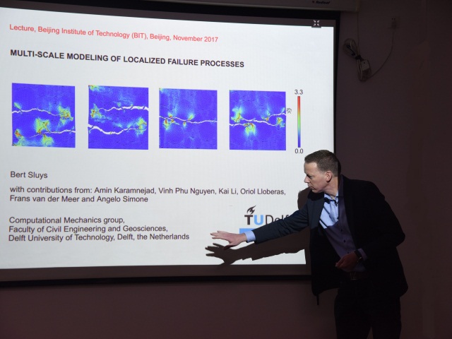 訪問期間,Sluys做了題為“Muti-scale modelling of localised failure processes”的學(xué)術(shù)報(bào)告。報(bào)告中,Bert Sluys重點(diǎn)介紹了微觀、細(xì)觀、宏觀尺度下的失效模型,提出基于RVE的復(fù)合材料多尺度模擬方法,改進(jìn)了適用于軟化材料的計(jì)算模型等。報(bào)告結(jié)束后,Sluys對(duì)在場師生提出的問題進(jìn)行了認(rèn)真而詳細(xì)的回答,并與師生們展開了熱烈的討論。