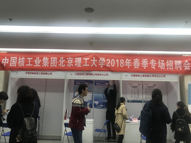 4月3日下午,北理工在體育館南廳舉辦了中國核工業集團春季專場招聘會。中國核電工程有限公司、中國原子能科學研究院、中國原子能工業有限公司、中國核科技信息和經濟研究院等35家單位組團參加了本次招聘會。