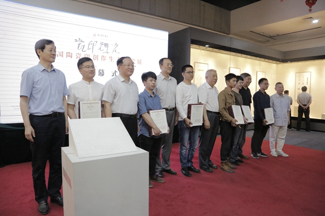 展覽通過“文獻考察”與“作品展覽”兩部分將陶瓷印的歷史和當代發(fā)展進行了梳理。“作品展覽”通過特邀和征稿的方式展出108位藝術(shù)家的200余件陶瓷印的印章原作,另每位作者還在印屏上展示了3至10幅印蛻作品。本次展出的“征稿作品”部分,是評委會對應征參選的作品進行了評選,評為獲獎作者和參展作者兩部分。李和章、王鏞、陳國斌、畢開艾、崔晗、李長春在開幕式上為姜軼、譚玉祥、武拙園、王志國、徐明春、崔紅濤等6名獲獎者頒獎。