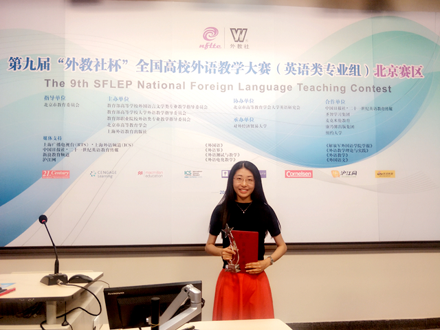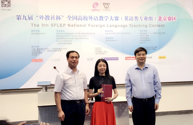 6月9日至10日,第九屆“外教社杯”全國高校外語教學大賽北京賽區的復賽及決賽在對外經貿大學舉行。本次比賽分為英語專業組和商務英語組,來自北京市40余所高校的50余名優秀教師參加角逐。北京理工大學外國語學院選派了曾在今年4月學院青年教師教學基本功比賽中教學演示環節榮獲一等獎的青年教師劉露,代表北京理工大學參加英語專業組的比賽。在為期兩天緊張而激烈的賽程中,劉露老師以優美流暢的語音語調和邏輯嚴謹的課堂設計,在復賽的講課環節和決賽的說課環節脫穎而出,最終斬獲英語專業組特等獎,即將代表北京賽區參加11月的全國決賽。