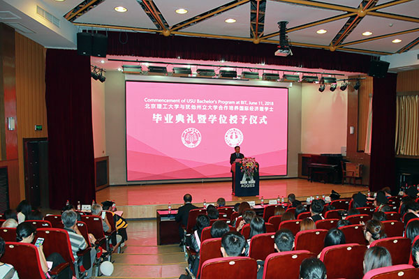 6月11日下午,北京理工大學國際教育學院在七號樓報告廳舉行北京理工大學與美國猶他州立大學合作辦學項目國際經濟專業2018屆本科生畢業典禮。出席畢業典禮的有北京理工大學副校長王曉鋒,猶他州立大學副校長Robert Wagner、副教務長Janis Boettinger,亨茨曼商學院中國項目主任Dwight Israelsen、副主任Jason Smith,自然資源學院Eugene Schupp教授,北京理工大學國際交流合作處、國際教育學院相關負責人,以及學院部分教職工、全體畢業生及學生家長。典禮由國際教育學院院長梅文博主持。