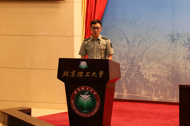 畢業國防生代表李昊上臺發言。他表達了對母校的辛勤栽培和對部隊、學校領導殷切關心的感激之情,抒發了離別時的不舍與留戀。他代表全體畢業國防生立下誓言:報效祖國、矢志不渝,端正態度、虛心學習,勇于吃苦、錘煉作風,在工作崗位上跑好軍旅人生第一棒。