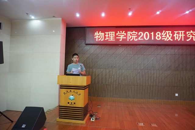 2018級研究生尹思瀚代表新生發言。尹思瀚同學表達了考入物理學院的激動心情,講到自己作為一名新北理人對“德以明理、學以精工”校訓的理解。對即將開始的研究生階段學習,表示將盡快從思想上完成從本科生到研究生身份的轉換,樹立高遠的人生志向,注重自主性、創新性的學習,牢記“團結、勤奮、求實、創新”的校風,在學術領域積極探索,刻苦鉆研,追求卓越。