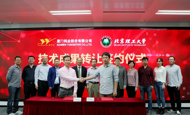 在取得創(chuàng)新成果的基礎(chǔ)上,團(tuán)隊(duì)、學(xué)院及技術(shù)轉(zhuǎn)移中心等學(xué)校相關(guān)部門研究決定,通過產(chǎn)學(xué)研結(jié)合方式,充分利用企業(yè)的生產(chǎn)和市場(chǎng)優(yōu)勢(shì),加速實(shí)施成果轉(zhuǎn)化。此前,校企雙方經(jīng)過深入洽談交流,商定了通過許可方式和“入門費(fèi)+產(chǎn)值提成”模式,實(shí)施該項(xiàng)成果的轉(zhuǎn)化應(yīng)用,并履行了技術(shù)轉(zhuǎn)讓的相關(guān)審核審批手續(xù)。會(huì)上,雙方代表簽訂了協(xié)議。根據(jù)雙方達(dá)成的協(xié)議,經(jīng)學(xué)校授權(quán),廈門鎢業(yè)股份有限公司將負(fù)責(zé)實(shí)施該材料的產(chǎn)業(yè)化批量生產(chǎn),并直接應(yīng)用于相關(guān)產(chǎn)品。