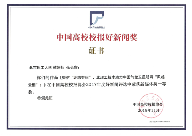 12月3日至4日,中國高校校報協會2018年年會暨第三屆中國高校傳媒發展高端論壇在福州舉辦,論壇以“跨界創新——全媒體時代如何講好校園故事”為主題。論壇上揭曉了2017年度“中國高校校報好新聞”評選結果,我校校報榮獲佳績。其中,《微信“地球變臉”,北理工技術助力中國氣象衛星明辨“風起云涌”!》榮獲新媒體類一等獎,《為你演繹“大學物理傳奇”》榮獲通訊類二等獎,《不忘初心 走向百年》榮獲言論類二等獎,《【北理畢業季】2017年春季研究生畢業典禮暨學位授予儀式隆重舉行》榮獲新聞攝影類二等獎,《宇宙中,來自北理工的一顆星》榮獲消息類三等獎。