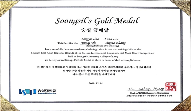 2018年11月28日至12月1日,第23屆“史丹森”國際環境法模擬法庭大賽(Stetson’s International Environmental Moot Court Competition,IEMCC)東亞賽區選拔賽(East Asia Regional Rounds,EARR)在韓國崇實大學(Soongsil University)舉行。北京理工大學法學院代表隊一路過關斬將,力克群雄,最終勇奪冠軍,并獲得了赴美國參加全球總決賽的資格。本次大賽中,石若琪同學獲得了總決賽最佳辯手(Best Oralist in the Final Round),鄒祺芊同學獲得最佳辯手第三名(Third Oralist)。