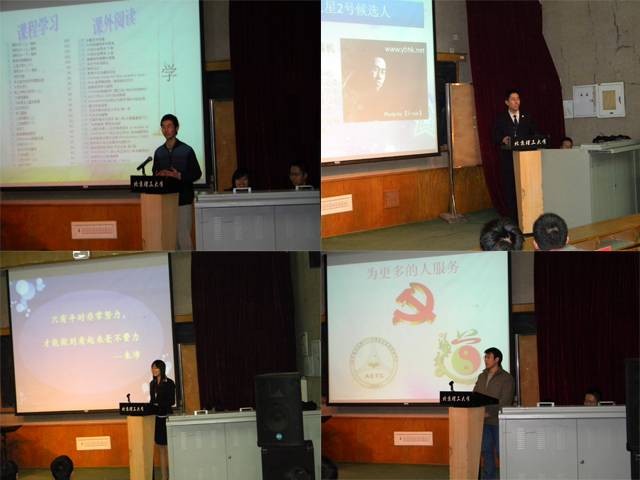 經過激烈的初賽評比,選出“學習之星”候選人3人,“工作之星”候選人5人,“體育之星”候選人2人,“文藝之星”候選人3人。候選人中的06級,07級的本科生以及研究生,都在平時的學習,生活和工作等各個方面都有不俗的成績,他們是學生中的佼佼者,而今天,他們都為了同一個榮譽,為了證明自己、超越自己而走上這個平臺。