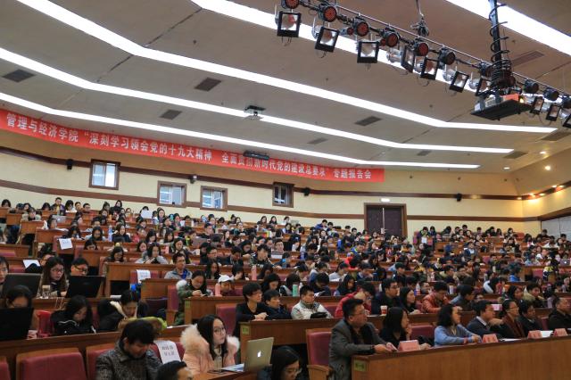 為全面貫徹黨的教育方針、落實立德樹人根本任務,廣泛動員青年學子深入學習領會黨的十九大精神,2017年11月24日,管理與經濟學院“深刻學習領會黨的十九大精神,全面貫徹新時代的建設總要求”專題報告會在中心教學樓報告成功舉辦。中央文獻研究室機關黨委副書記、機關紀委書記、黨的十九大代表孫東升作專題報告,學校黨委組織部副部長周波,管理與經濟學院黨委書記王兆華,院黨委副書記、副院長彭明雪,共建單位中國銀行海淀支行黨委的黨員代表出席了報告會。本次報告會采取兩校區同步直播方式進行,管理與經濟學院本科和研究生共800余人共同聆聽了專題報告。