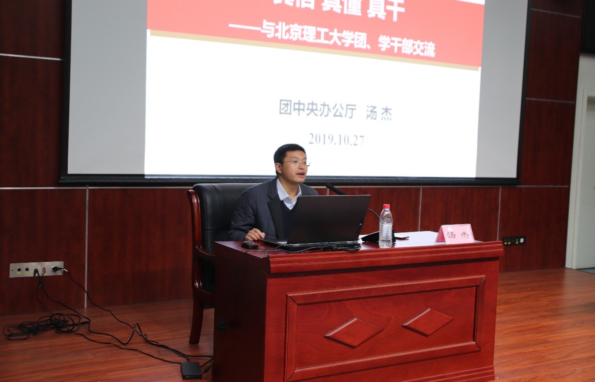湯杰作了題為《真信、真懂 、真干》的輔導報告。他回顧了北理工參與國慶70周年慶祝活動的主要情況,分享了他眼中的北理工和北理工精神,鼓舞學生骨干傳承紅色基因,勇敢擔負新時代賦予當代北理工青年的使命責任。授課過程中,他從青年信仰解讀、青年工作理論、引導青年的方式方法出發,與同學們交流了怎樣當好一名優秀學生骨干。他鼓勵同學們牢記習近平總書記提出的“理想、愛國、擔當、奮斗、學習、品德”六方面希望,從現在做起、從小事做起,努力求真學問、練真本領,不斷奮發成長成才。