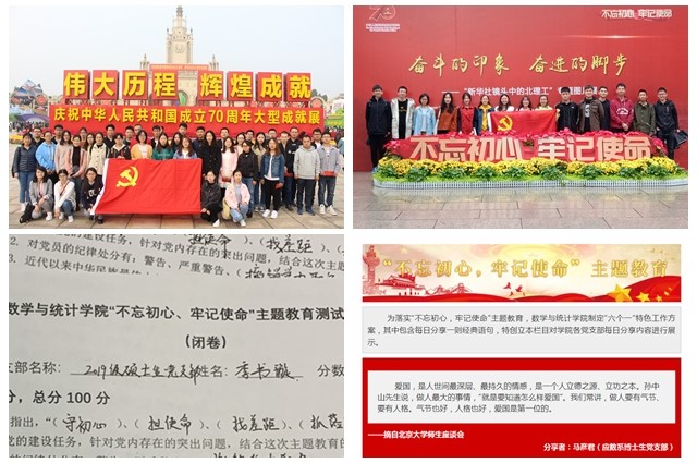 在主題黨日中受洗禮。結合新中國成立70周年和校慶79周年的契機,各黨支部開展了參觀走訪、觀看影片、聆聽報告等多種形式的黨日活動。黨委委員和機關黨支部全體成員赴方山縣與當地村黨支部聯合開展了“支部共學入心、專題黨課聚焦、扶貧捐贈助力”的黨日活動。數學系博士生黨支部開展了“我的政治生日,映照初心使命”活動,為6名黨員集體過政治生日,許下整改自身差距的“愿望”。統計與概率系博士生黨支部等5個支部的黨員參觀了“偉大歷程,輝煌成就——慶祝中華人民共和國成立70周年大型成就展”,在回顧黨和國家發展歷程及輝煌成果中,堅定信仰,樹立“四個自信”。