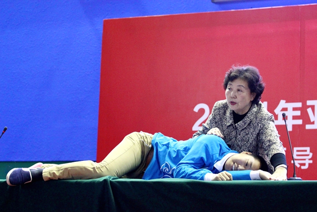 早上七點半,大部分志愿者還沉浸在夢鄉之中,鄧恒(大四學生)和于謙(大三學生)同學卻早早地來到了會場。原來,他們要配合馬桂林老師給志愿者們講解急救的相關知識。作為急救模特,他們四次走上講臺,用自己的表演向臺下的志愿者們介紹了心臟起搏、地震脫險、包扎捆綁、處理氣管內異物的相關知識。他們用自己的親身實踐加深了同學們對急救知識的理解與記憶,同時自己也受益匪淺,鄧恒同學就談到:“我覺得,作為志愿者,首先要有自我保護和保護他人的能力,這樣志愿服務才有意義、有保障,馬老師生動地給我們上了一節急救自護課,我想這會成為我一生中美好而難忘的回憶。”