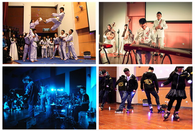 隨后,社團表演正式亮相,從黑白漫畫社炫酷搞笑的《時光  未央》,到相聲社爆笑的《出口成章》,到飛嬈古風社唯美的《禮儀之邦》,逐漸將氣氛推向高潮;武術協會和無陽齋書畫社聯合呈現的《筆墨武林》,以入木三分的即興書法為背景,行云流水地展現了傳統武術的柔風勁骨,同時,特邀峨眉拳大師及弟子現場演示的峨眉拳,讓同學們領略到了武術的極致魅力;鄉琴協會一曲《Rocking your heart》狂野搖滾,讓大家的心都似乎跟著節奏跳動;抖之道空竹社《空竹炫舞》讓抖動的空竹舞出了絢麗和華美。