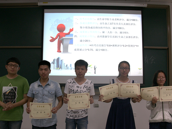 。。2015年5月14日晚,“生命之美——生命科學(xué)文化月”活動(dòng)閉幕式在良鄉(xiāng)校區(qū)順利舉行。經(jīng)過一個(gè)多月的緊張活動(dòng),“生命之美——生命科學(xué)文化月”系列活動(dòng)在學(xué)校領(lǐng)導(dǎo)、老師、同學(xué)們的共同努力下,畫上了圓滿的句號(hào)。參加本次閉幕式的有“生命之家”社團(tuán)指導(dǎo)老師劉惠康,以及在本次“小型生態(tài)科考模擬實(shí)踐”和“攝影比賽”活動(dòng)中取得優(yōu)異成績的同學(xué)。
