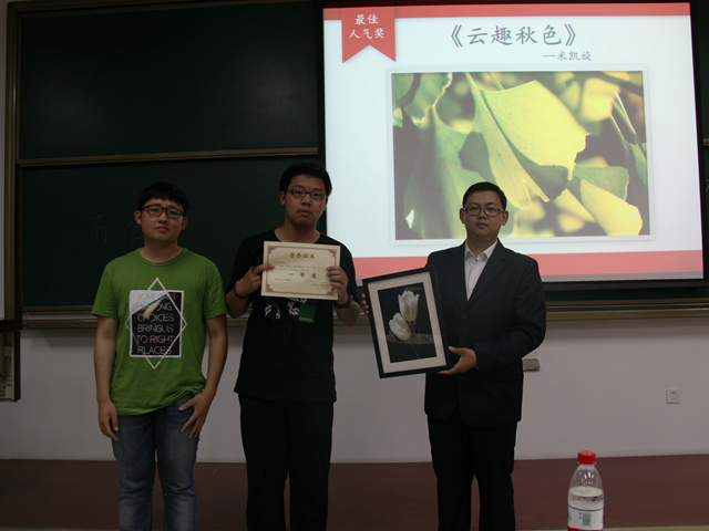 接著,“生命之家”宣傳部部長曹銘銘宣布了在“生命之美”攝影比賽中取得優(yōu)異成果的同學(xué)們。并展示了他們優(yōu)秀的作品,由劉惠康老師為獲獎(jiǎng)作者頒發(fā)獎(jiǎng)狀和獎(jiǎng)品。隨后,由劉惠康老師致辭,對(duì)“生命之美——生命科學(xué)文化月”系列活動(dòng)做了總結(jié),并對(duì)本次活動(dòng)取得的成果給予肯定,對(duì)每一位參與活動(dòng)的同學(xué)給予認(rèn)同。他還鼓勵(lì)同學(xué)們多參與到類似的活動(dòng)中去,在活動(dòng)中不斷的提高自己綜合能力。