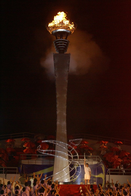 開幕式隨著大運會火炬的點燃而達到高潮。特別是當(dāng)?shù)?8屆奧運會跳水男子雙人跳臺冠軍、廣東籍選手楊景輝從主席臺跑向神圣的火炬臺,點燃以“書”堆砌的高聳云天的火炬時,引發(fā)了全場的歡呼和熱烈掌聲。最后在激昂的歌聲中,激光射向全場,瀑布焰火飛流直下。熊熊的圣火照亮廣州夜空,臺上臺下運動員和大學(xué)生觀眾激情互動。